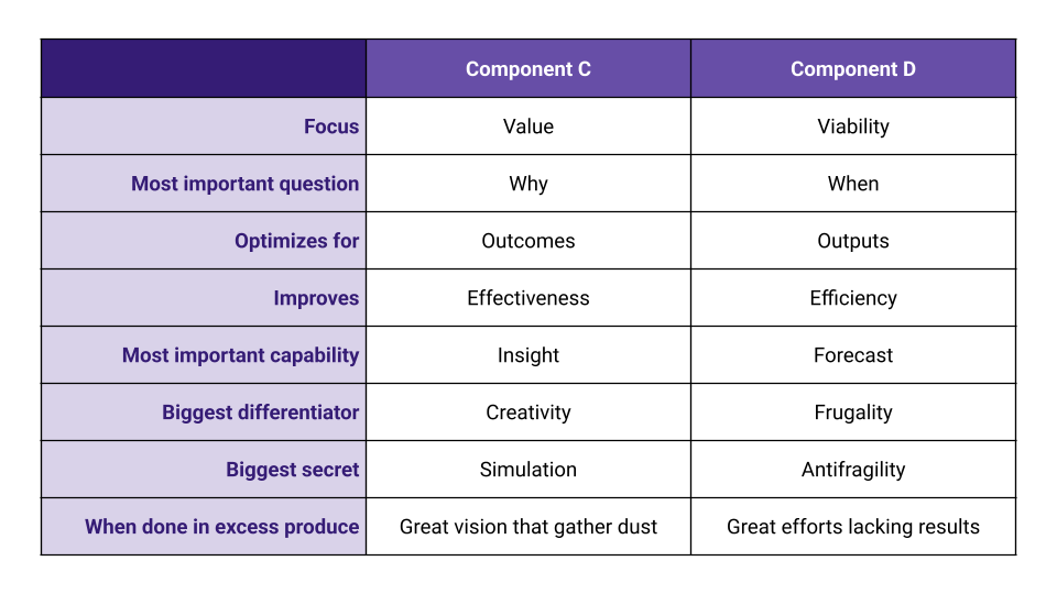 Component D transforms this vision into reality – it's where the story becomes action. This phase will rely heavily (80%) on the Work and Team aspects of the Backbone, focusing on the processes, collaboration, and execution required to bring the vision to life. Only 20% will be based on Impact and Usage, as these aspects have been thoroughly considered in the "design" phase.